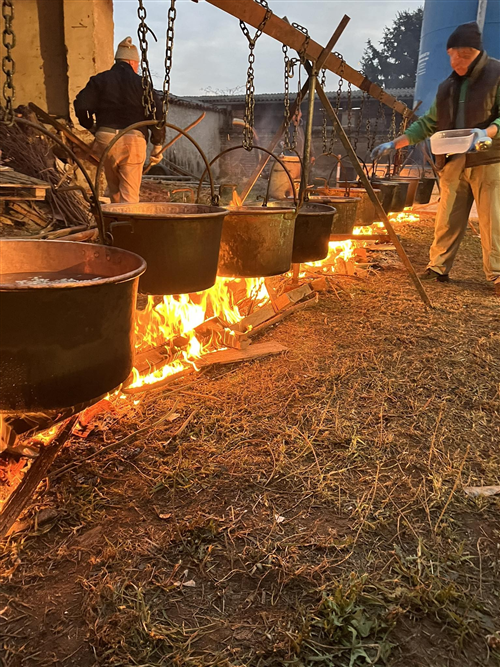 Affettati, lingua in salsa, tomini sott'olio, panissa, agnolotti al ragù/burro e salvia, penne al ragù, grigliata di carne, formaggi, dolci.
